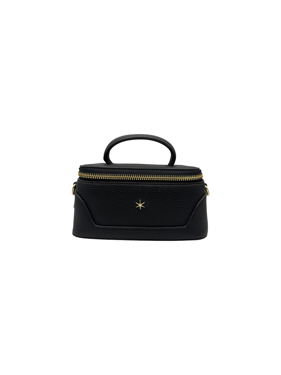 A chic small black handbag with golden zipper detail and a sturdy top handle. Comes...