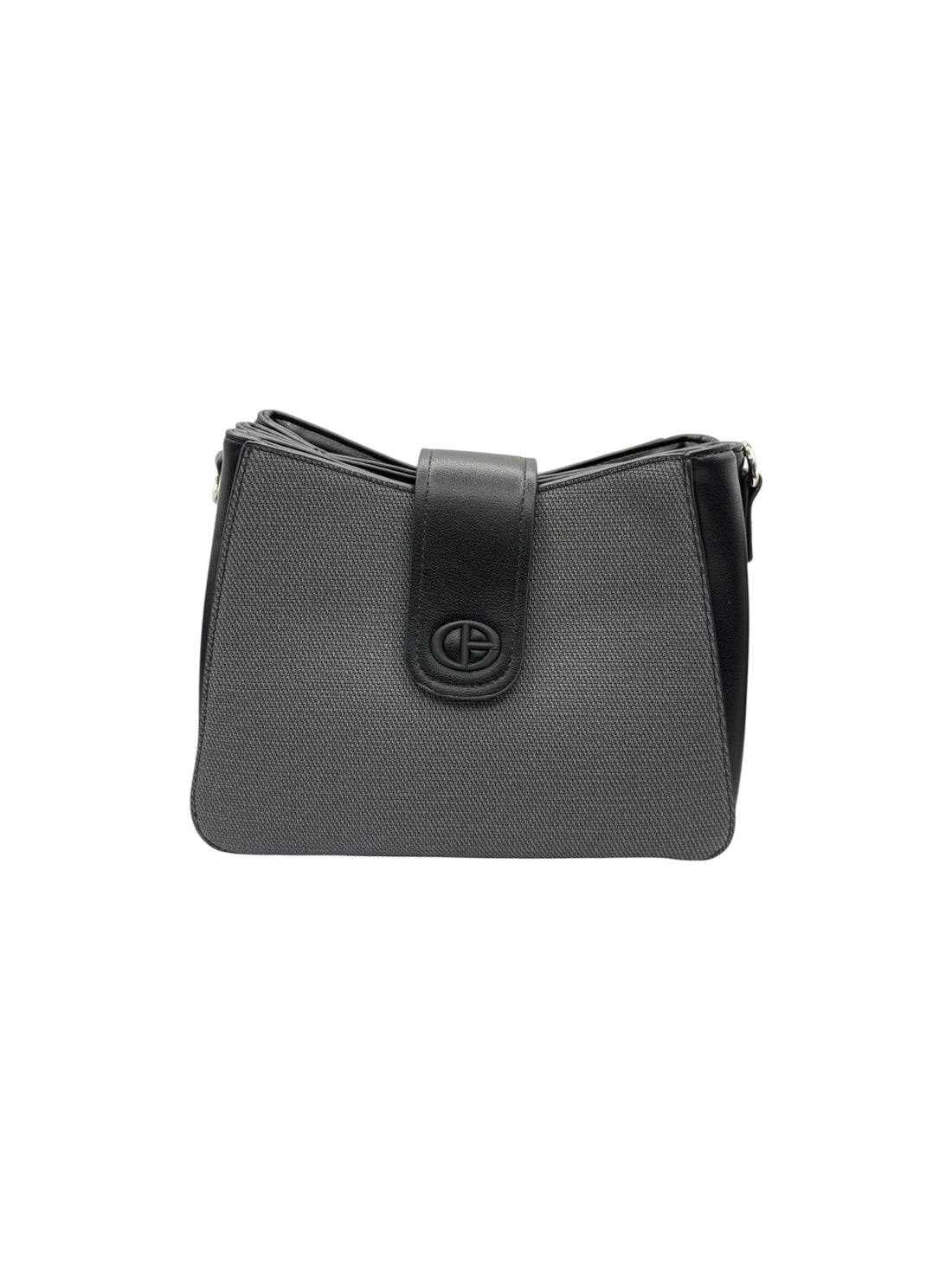 A modern shoulder bag in gray and black with a secure button clasp. Includes both...