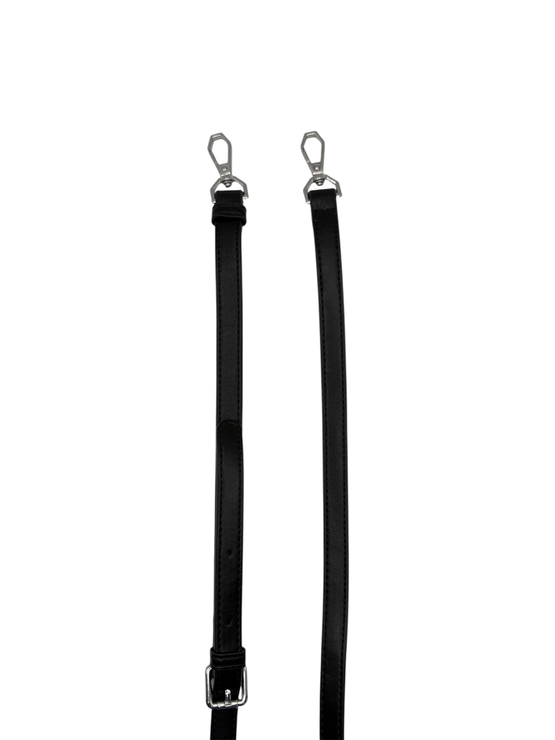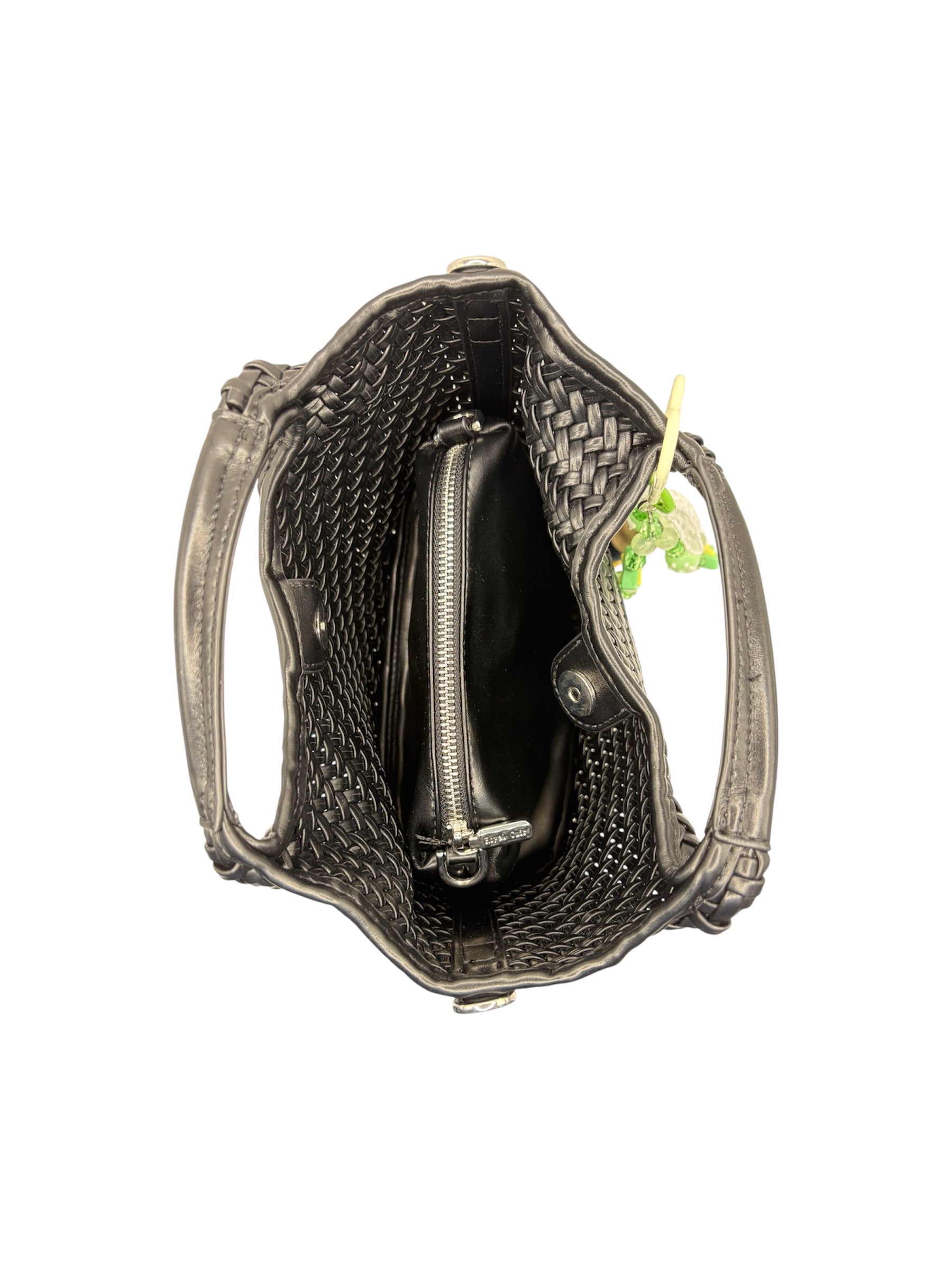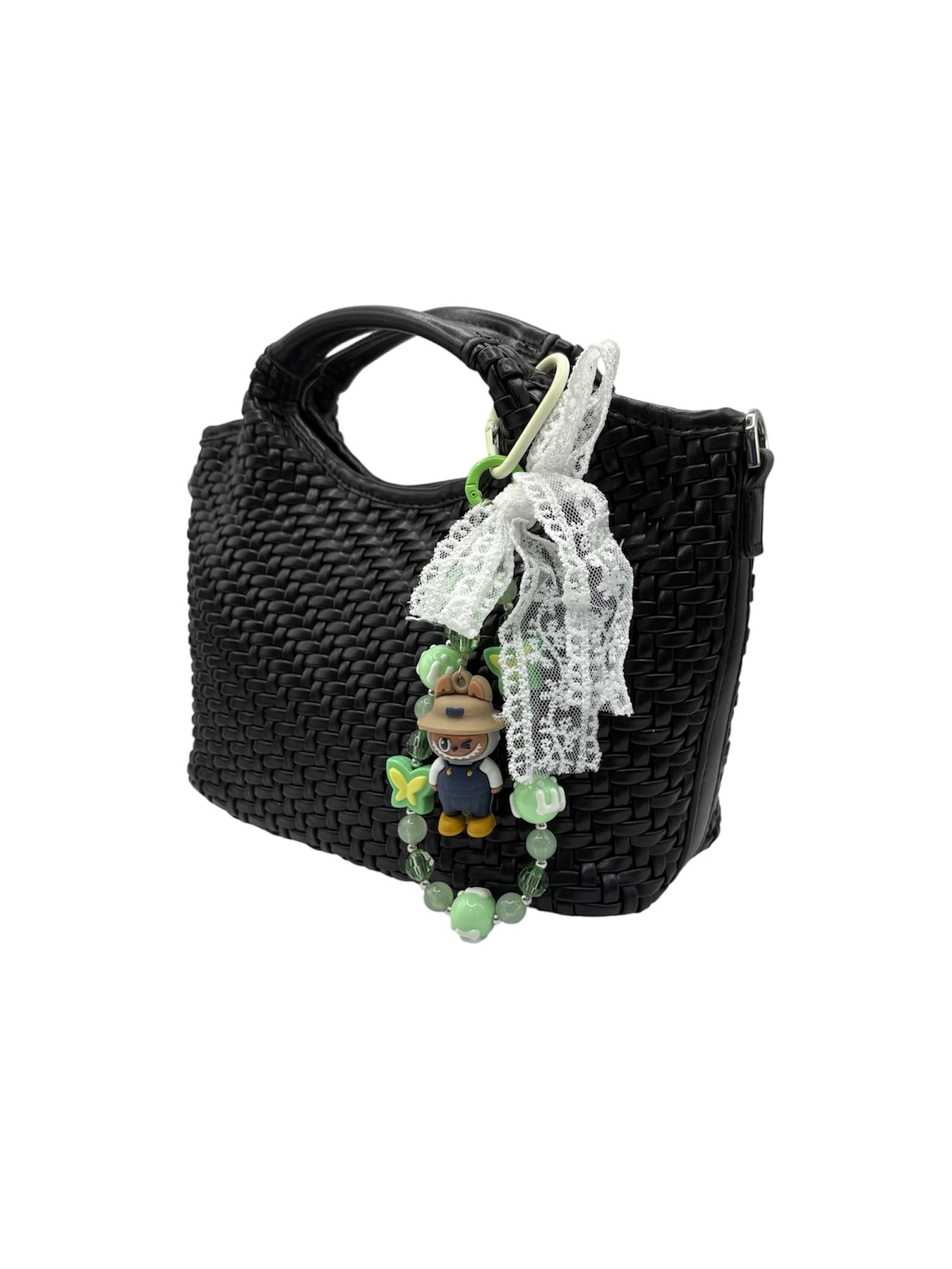 A two-piece handbag set featuring a black woven design with a detachable inner pouch. Comes with a removable adjustable long strap for crossbody use. Stylish and practical, decorated with a playful charm.